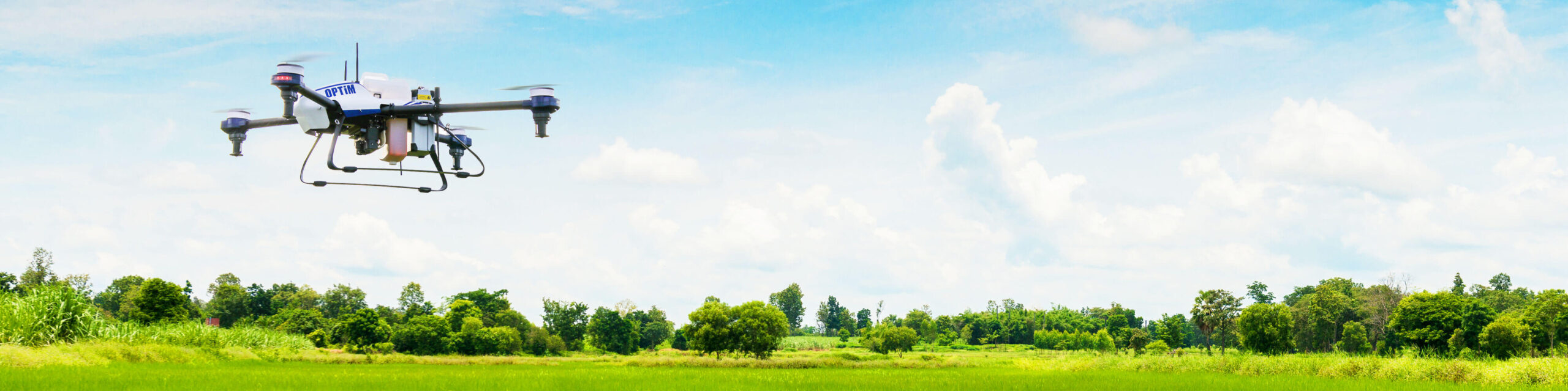 Máy bay không người lái bay qua cánh đồng và chụp ảnh. AI được sử dụng để so sánh hình ảnh chụp được với hình ảnh sâu bệnh và kích hoạt chức năng phun thuốc trừ sâu tại điểm xuất hiện.