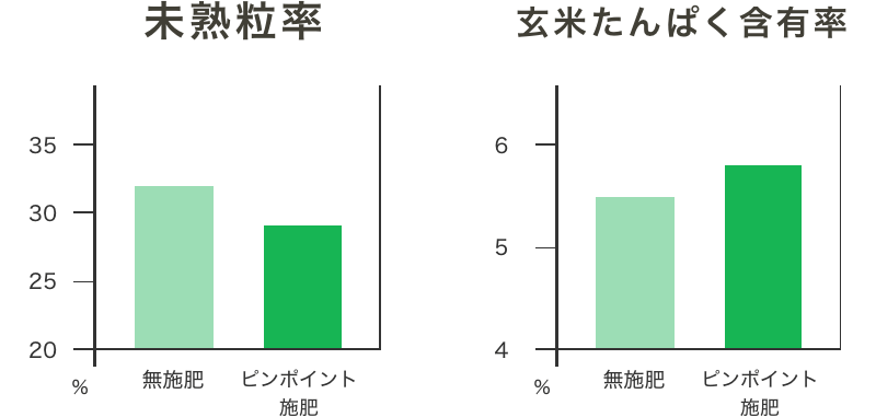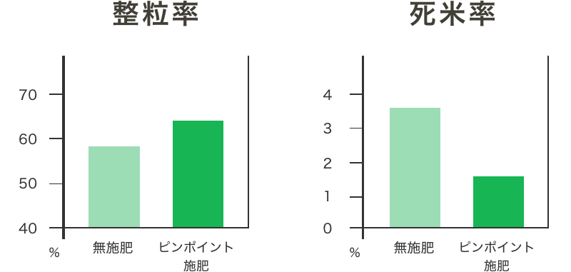 Ở những lô bón thúc có sự cải thiện đáng kể về “tỷ lệ hạt nguyên”, “tỷ lệ gạo chết” và “tỷ lệ hạt non” ảnh hưởng đến tỷ lệ đánh bóng gạo so với những lô không bón phân. Ngoài ra, chúng tôi có thể giữ “hàm lượng protein gạo lứt” trong khu vực bón thúc ở mức dưới 6,0%.